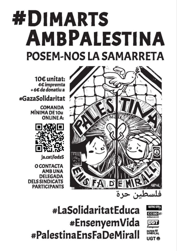 Seguim lluitant en suport al poble palestí i contra el genocidi. Com a sindicat de classe i internacionalista no podem deixar de banda les mobilitzacions per la llibertat del poble palestí i la fi del genocidi i l’ocupació sionista. I com a educadores hem d’intentar trencar el silenci als centres educatius a on encara no es parla de Palestina: seguim donant suport als Dimarts Amb Palestina, seguim mobilitzant-nos i fent una crida al conjunt de sindicats a organitzar una vaga general si persisteix el brutal genocidi i la complicitat d’empreses i governs.