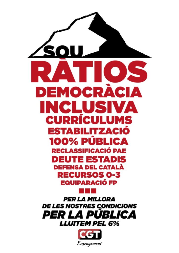 Hi ha un consens general que enguany la lluita de les treballadores de l’educació ha de posar al centre la recuperació del 25% de poder adquisitiu perdut i la reducció de la sobrecàrrega de feina i de tasques burocràtiques. Però des de CGT Ensenyament creiem urgent també exigir la baixada de ràtios, més plantilla docent i d’atenció educativa per fer real la inclusiva o la millora de la formació d’adults eternament oblidada i d’altres recursos que serien perfectament possibles si la inversió en educació fos el 6% del PIB que diu la mateixa LEC.