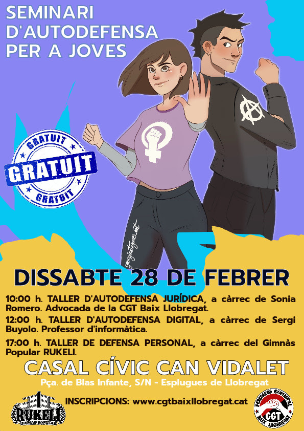 Des de la Federació Comarcal de la CGT Baix Llobregat amb la col·laboració de Rukeli Gym de l’Obrera de Sabadell hem preparat un seminari d’autodefensa pensat especialment per a joves d’entre 16 i 26 anys que tindrà lloc el pròxim dissabte 28 de febrer al Casal Cívic de Can Vidalet a la Pl. Blas Infante S/N d’Esplugues de Llobregat.