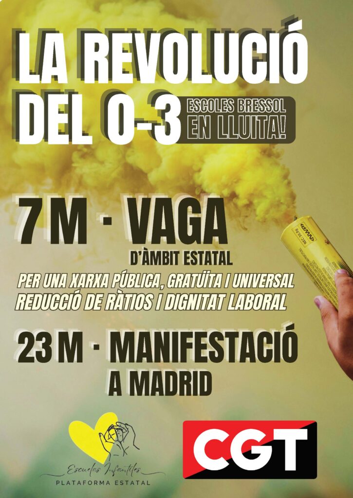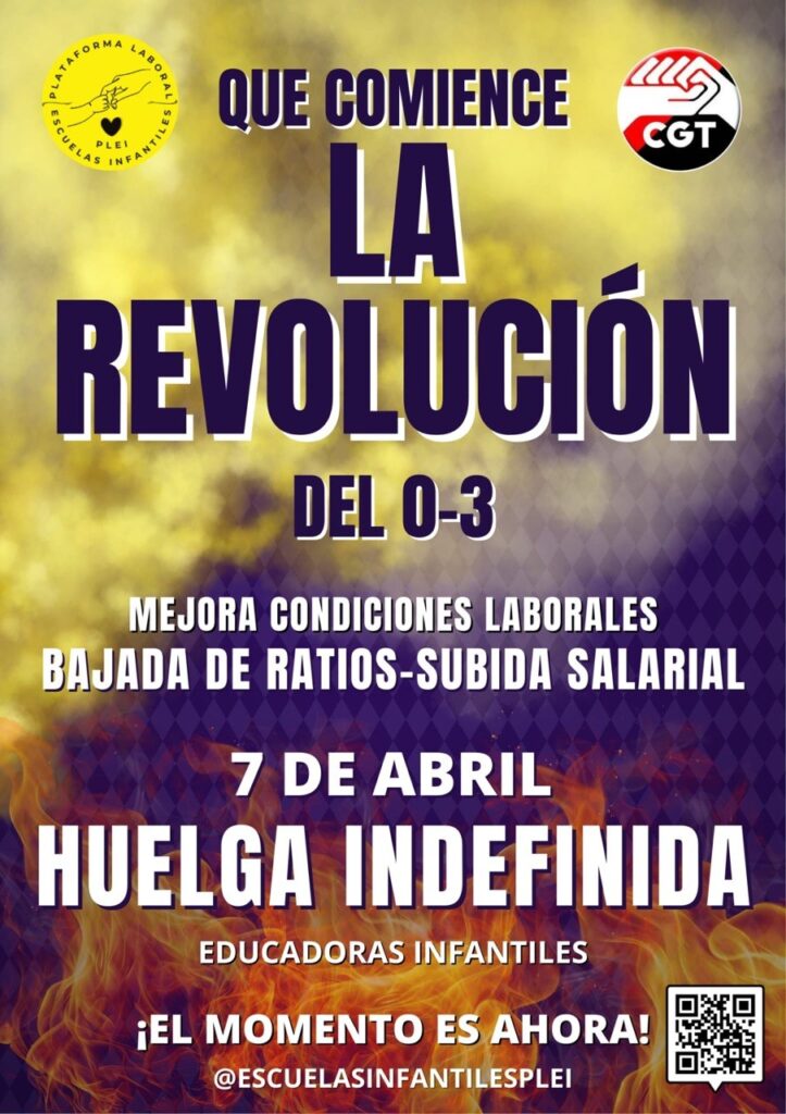 En l’àmbit estatal, la PLEI (Plataforma Laboral Escuelas Infantiles, de Madrid) de la mà de CGT està en vaga indefinida des del 7 d’abril. Les reivindicacions de la Plataforma van molt més enllà d’una demanda concreta, busquen canviar el paradigma actual del 0-3 per tal d’aconseguir dignificar l’etapa, d’una vegada per totes i arreu, perquè no volem continuar permetent que els drets de les treballadores i la petita infància no depenguin d’un codi postal ni estiguin condicionades a l’atzar.