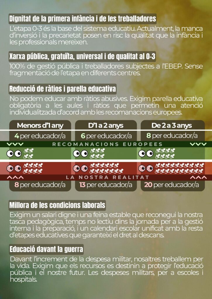 I perquè podríem continuar citant un llarg etcètera de raons i segurament no acabaríem mai, i perquè la situació a la qual hem arribat és tan greu i tan injusta, veiem ben clar que l’única solució passa per a un canvi total de model, per això des de la CGT reclamarem persistentment que primer des de l’Estat, i després des de les comunitats autònomes, es desenvolupin unes lleis amb uns criteris i unes normatives que permetin posar punt final a la precarització del sector, i que a la vegada possibilitin realment una educació del 0-3 pública, de qualitat, universal i gratuïta.
