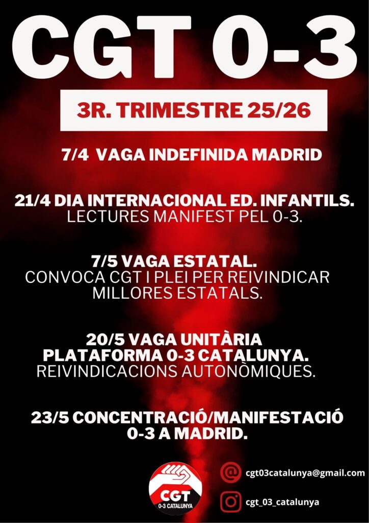 La primavera del 2026 es preveu molt moguda pel sector del 0-3. Des de CGT 0-3 Catalunya hem preparat un calendari per tal que a primer cop d’ull tothom es pugui situar i es vagi marcant les dates claus en el seu calendari.