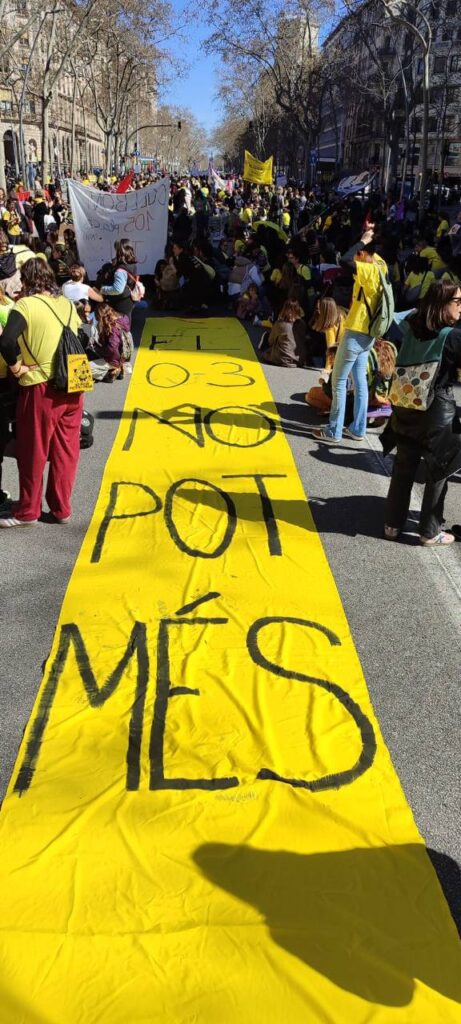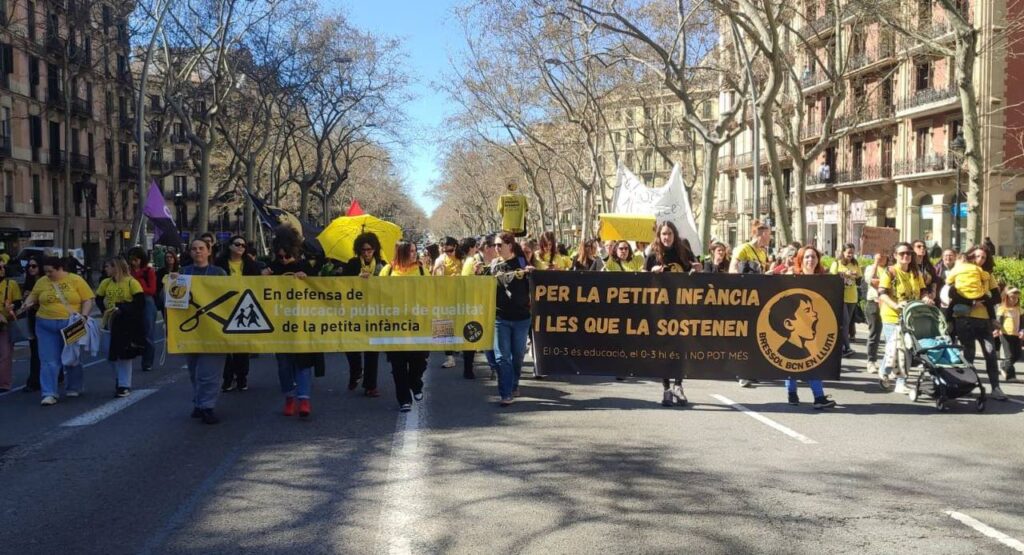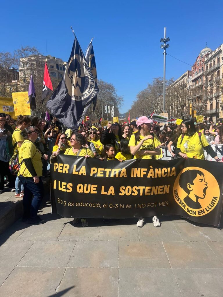 Diferents columnes van confluir fins a la plaça Tetuan i des d’allà una marea groga va inundar mitja ciutat. Les treballadores de la petita infància ens vam trobar acollides dins del bloc de la CGT, per una part i per l’altre, en un altre espai de la mateixa manifestació. La gran quantitat de gent, la diversitat de tempos i capacitat d’espera va fer que quedéssim separades en dos grans blocs, però sabem del cert que cada un va destacar i va deixar posar l’accent en les reivindicacions de la nostra etapa deixant clar que el 0-3 NO POT MÉS i és urgent que la Generalitat comenci a implementar mesures per trencar d’una vegada per totes amb la precarització de les seves treballadores i la petita infància.