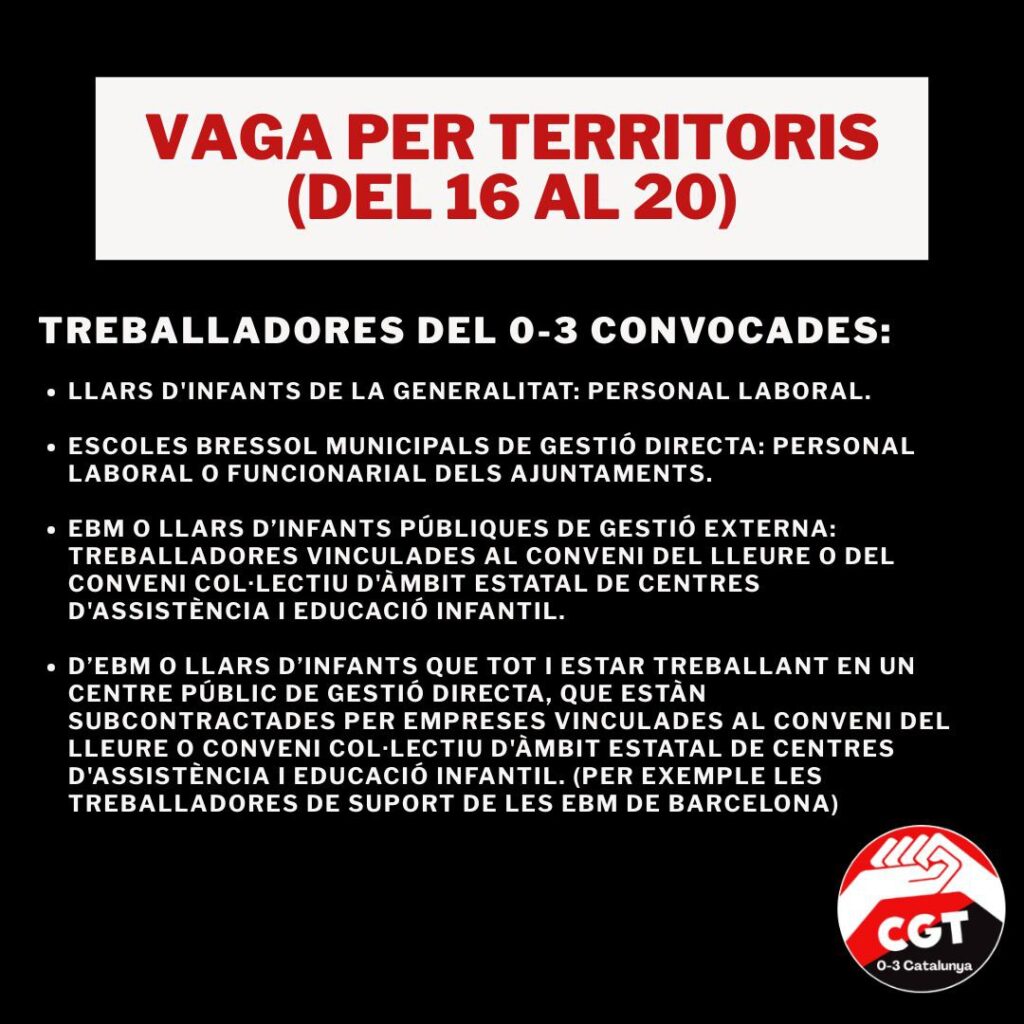 Durant la setmana del 16 al 20 de març, i dins el context de la vaga educativa, des de la CGT hem convocat a tots els subsectors relacionats amb el món de l’educació. Donat que creiem que el 0-3 encara no està del tot organitzat per fer una vaga en solitari (perquè la diversitat de models a la que ens trobem abocats ens dificulten molt la xarxa i la lluita coordinada del sector), hi ha molts territoris i moltes professionals amb ganes de sortir al carrer a defensar i reivindicar tot el que fa tants i tants anys hem sostingut dins les escoles. Per aquest motiu, i perquè hi ha condicions que sí que poden modificar-se des del Govern amb una nova llei o decret, i que, per tant, no caldria entrar a tractar en meses sectorials ni amb les patronals, l’afiliació de la CGT ha apostat perquè durant aquest cicle de lluita les treballadores del 0-3 que treballen en una escola bressol o llar d’infants pública puguin afegir-se a les vagues del seu territori del dia 20, i així puguin fer visible les seves reivindicacions, sigui cap a l’administració local o l’administració autonòmica.
