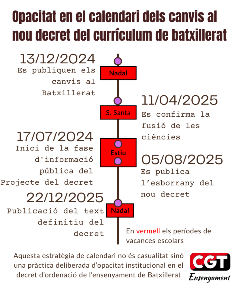 El Departament d’Educació i Formació Professional ha fet públic, novament en ple període de vacances, un Decret que modifica el currículum de Batxillerat per al curs 2026-2027. Aquest Decret aprovat el 22 de desembre de 2025 inclou la fusió de les assignatures de ciències de primer de batxillerat (física i química, i biologia amb geologia i ciències ambientals en dues matèries de 4 hores setmanals), així com la reducció del pes del treball de recerca i altres ajustos de contingut i hores lectives. Aquest moviment s’ha fet sota l’argument d’homologació al marc estatal, però ha estat fonamentalment criticat pels col·lectius docents per manca de diàleg pedagògic i rigor acadèmic.