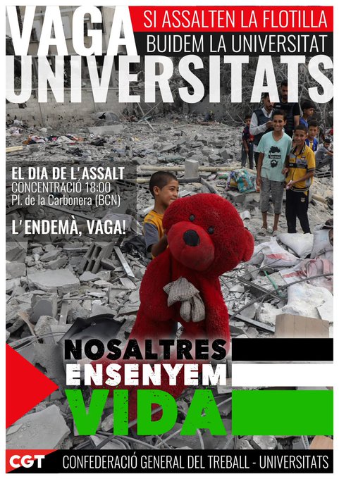 Davant d’aquesta terrible situació, CGT Universitats hem acordat convicar vaga indefinida a totes les universitats públiques catalanes a partir del dia 25 de setembre. Aquesta vaga serà efectiva l’endemà que es produeixi l’assalt a la flotilla i interpel·la a totes les treballadores (PDI i PTGAS) de les universitats públiques catalanes.